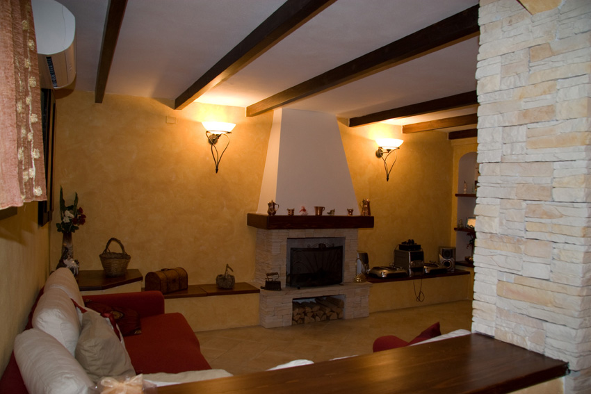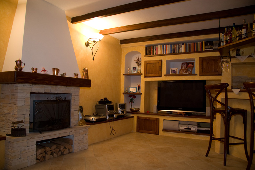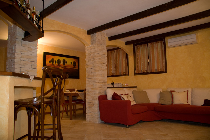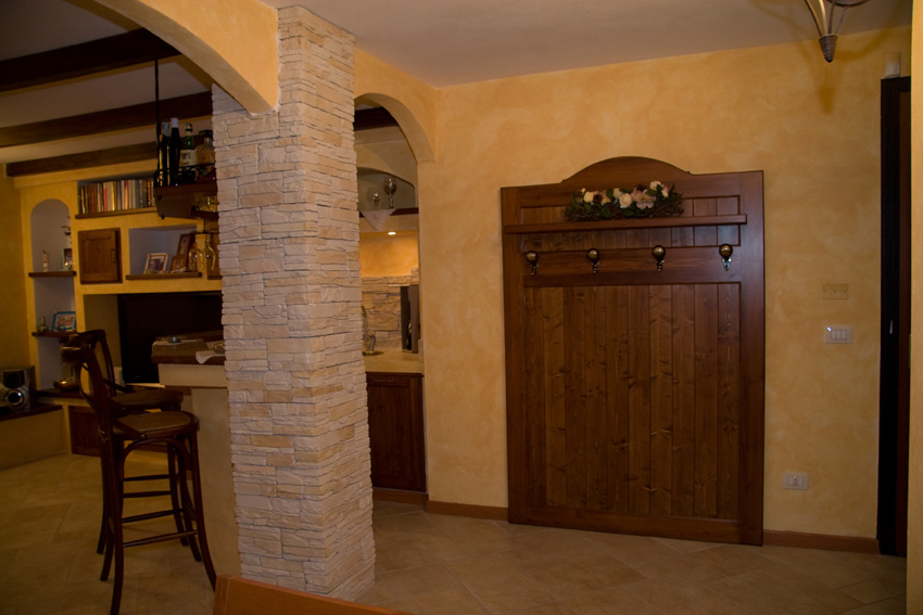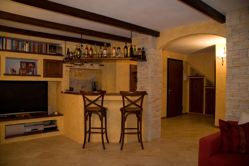 Ampia, rilassante e molto accogliente: queste sono le sensazioni che ci vengono regalate entrando in questa taverna.Si trattava di un ambiente completamente vuoto che presentava un unico ostacolo: un pilastro portante costruito in una posizione poco pratica che, proprio per questo, ha monopolizzato lo studio di tutto lo spazio circostante.E siamo partiti proprio da qui: abbiamo costruito un pilastro uguale, abbiamo rivestito entrambi con pietre ricomposte lasciando un passaggio ampio, e abbiamo collegato gli spazi vuoti con degli archi in muratura. L’arco di destra ha dato forma e spazio ad una zona bar con bancone e mensola sospesa, lavello e vani portabottiglie, dall’arco di sinistra nasce un muretto che separa la zona tavolo da pranzo dal divano.Il camino, con bruciatore a bioetanolo, ha trovato posto sulla parete principale ed è centrato sullo spazio di passaggio tra i due pilastri. Tutto l’arredo è in muratura con cestoni in legno, ante e mensole, nicchie e panche per sfruttare al meglio lo spazio. Le travi a soffitto sono in massello, tinta noce scuro.
